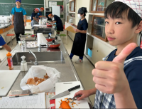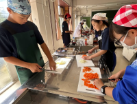 1年家庭科の調理実習の様子です。班で協力して、「ミートスパゲティ」「杏仁豆腐」を作りました。