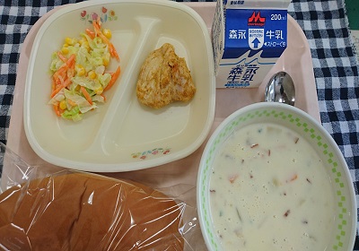 今日の給食は、ソフトパン、タンドリーチキン、コールスロー、クラムチャウダー です。