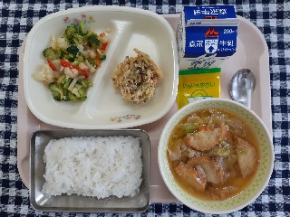 今日の給食は、ごはん、やさいふりかけ、さつまいものかき揚げ、花野菜サラダ、白菜と豚バラの煮物、牛乳です。