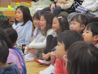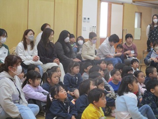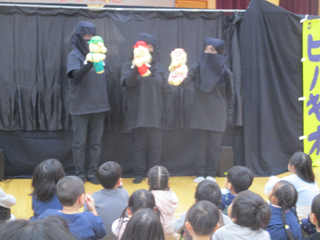 今日は第五幼稚園に お家の方と、第一幼稚園のお友達が集まり・・・ 人形劇のピノキオさんが来てくれました   「三びきのこぶた」 「にんじん・だいこん・ごぼう」 「おおきなかぶ」 「ケロダンス」 を観せてくれました    最後には年長さんが大きなかぶに挑戦!  5匹のカエル   「おうちの人、私がどの人形だったか わかったかな~?  」と言っていました  人形劇の後は、 第一幼稚園のお友達と一緒に 給食を食べました    とっても楽しい一日でした  ピノキオさん、第一幼稚園さん、お家の方々 みなさんありがとうございました  | | | | |