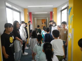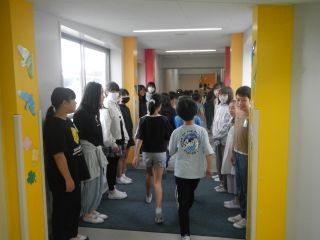 体育館に向かう通路の両側に立って、元気にあいさつをしています。
