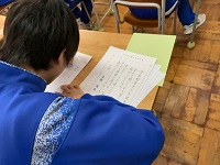 書きぞめ(硬筆)の練習中。静かに集中して取り組んでいる様子です。