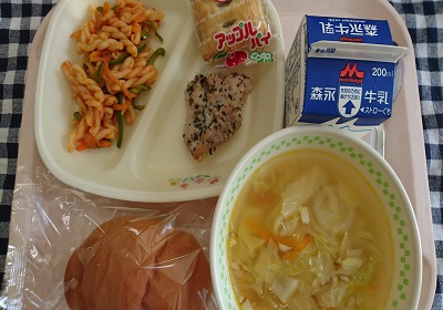 今日の給食は、バターロール、チキンバジル焼き、マカロニのケチャップ炒め、コンソメ野菜スープ、アップルパイ です。