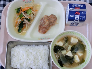 ごはん、中華風ローストチキン、チンゲンサイのサラダ、わかめとじゃがいものみそ汁