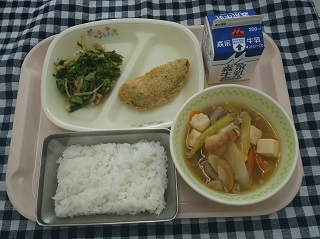 初日は、給食センターのHPにも掲載されていますが、「ごはん、幼稚園は揚げぎょうざ(2コ)、小中学校はさわらの磯辺フライ、菜の花のおかかあえ、油麩汁」でした。お米は地元食材を使いました。