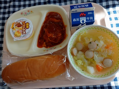 今日の給食は、ソフトパン、ハンバーグきのこソース、かぶとフランクフルトのスープ、くりのムース です。