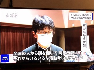 1月21日(土)、文部科学省東館3階講堂で、「令和4年度全国いじめ問題サミット」が開催され、本校からは生徒会長の鹿野松太郎さんが宮城県を代表して参加しました。全国各地の小・中学校のいじめ防止対策について学びを深めるとともに、記念講話やグループ協議に参加しました。NHKのインタビューにも応え、「全国の人から刺激を受けてこれからいろいろな活動をしていきたい」とコメントしました。