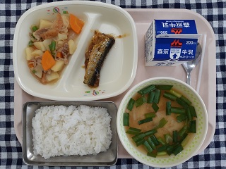 今日の給食は、ごはん、いわしのオレンジ煮、油麩肉じゃが、にらのみそ汁、牛乳です。