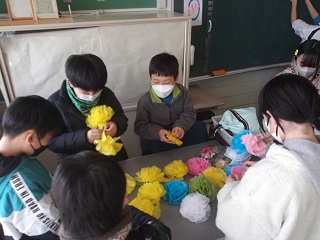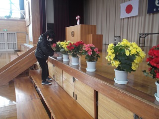 5年生は、卒業生に感謝の気持ちを込めて鉢花を飾ったり,