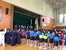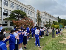 本日、中総体壮行式を行いました。松島中学校生徒、教職員のすべての思いを込めてエールを送りました。各部の決意表明には、部全体の熱い思いが込められていました。選手団へはその思いを後押しする応援生徒のエール、吹奏楽部の演奏が届けられました。事情があり出場できない生徒の思いも一緒に、一戦必勝で挑んで欲しいと思います。