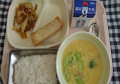 今日の給食は、ごはん、春巻、ホイコーロー、中華コーンスープ です。