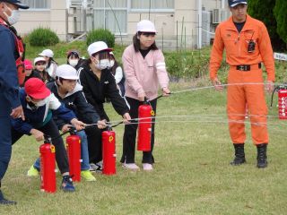 5年生は水消火器訓練をしました。