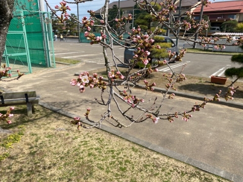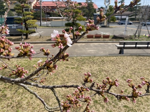 いよいよ松島でも桜が咲き始めました。文化観光交流館前の桜の木も少しずつ花開いてきました。今年も入園・入学式の日には、撮影スポットを準備しています。せひお越し下さい。
