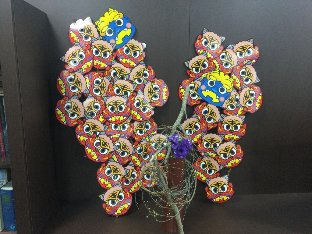 そこで、「これならどうだ」といわんばかり、大宮司班長に鬼の面を飾っていただきました。きっと願い(悪霊退散・コロナ退散)を叶えてくれるのではないかと思っています。