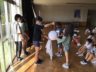 8月27日(木)、6年生から5年生へ大きなてるてる坊主が手渡されました。