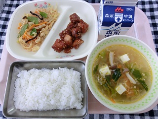 切干だいこんの煮物と豆腐スープは野菜がたっぷりのやさしい味付けで、バランスの良い給食でした。
