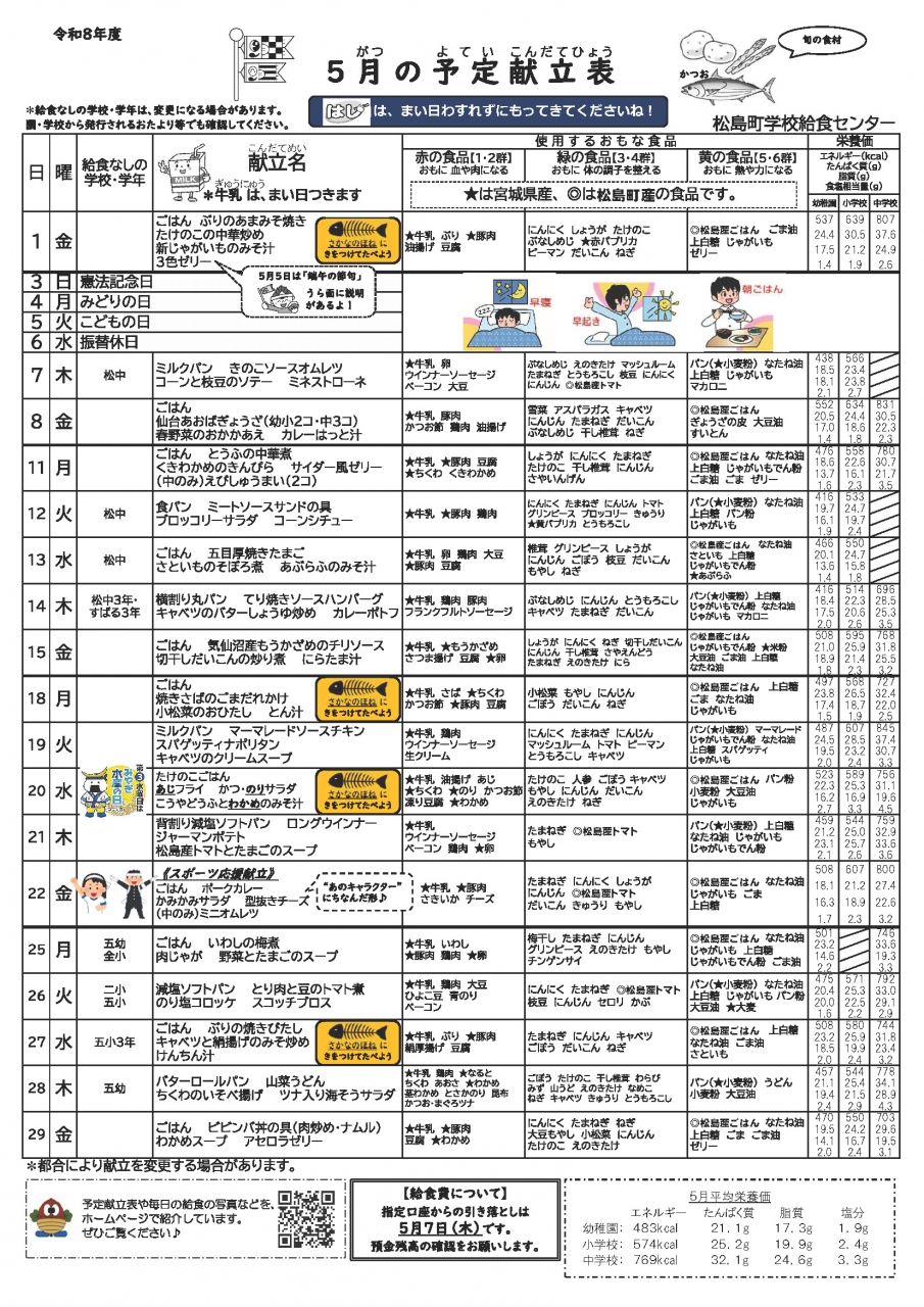松島町学校給食センターでは、「今日の給食」や毎月の「予定献立表」、「一口メモ」などを発信しております。