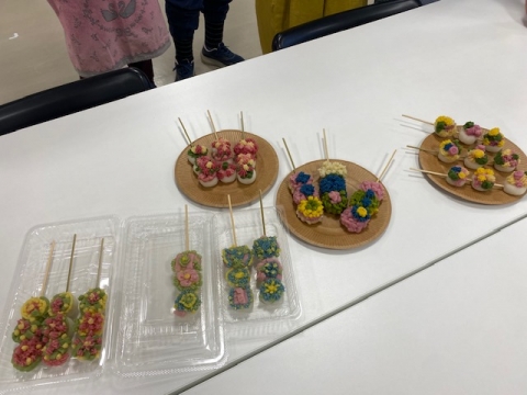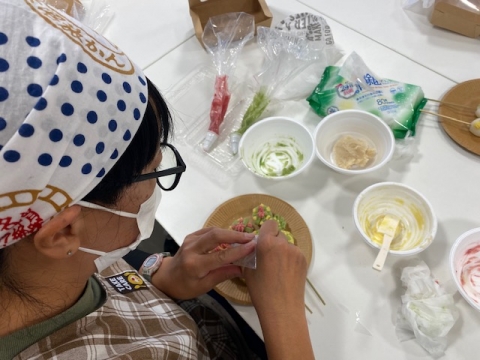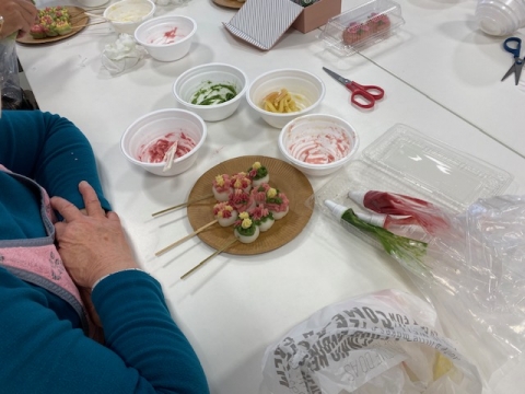 白インゲンのあんこに色づけし、形をつけていく繊細なものです。今回は、初心者向けで串団子にのせてみました。水間先生から最初に説明、一人ずつ回って指導いただき、どんどん作品ができあがっていきます。元は同じあんなのに着色や形付けは自由なのでひとりひとり違うものにできあがるので、お互いに評価しながら楽しい時間となりました。