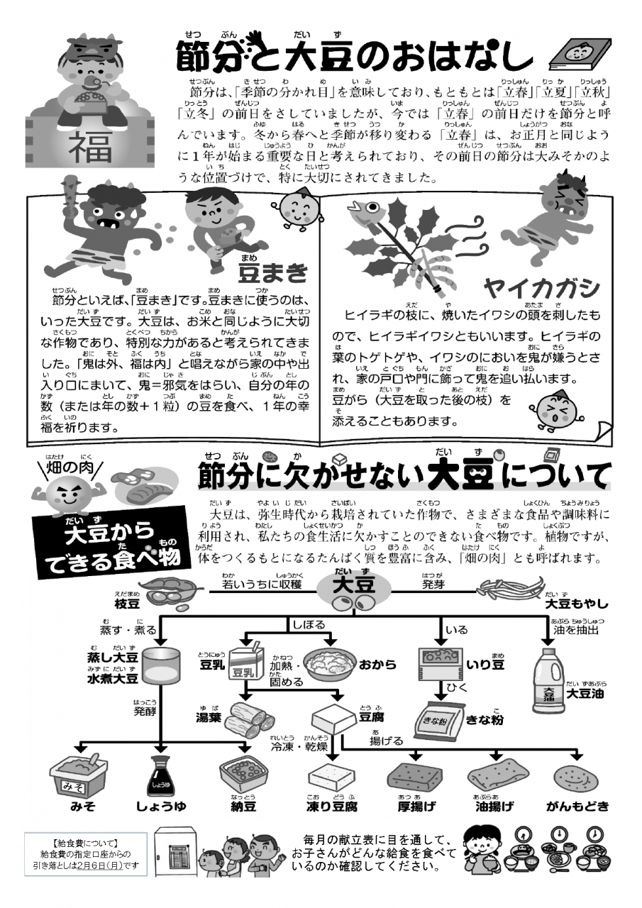 特に「一口メモ」では、その日の献立にまつわるお話を掲載しておりますので、様々な料理、色々な食材や栄養素等の知識、地域の食文化などを学ぶことができます。ぜひご覧いただき、ご家庭でも給食のお話や食に関する話題などで、児童生徒の「食への関心」を高めていただければ幸いに存じます。