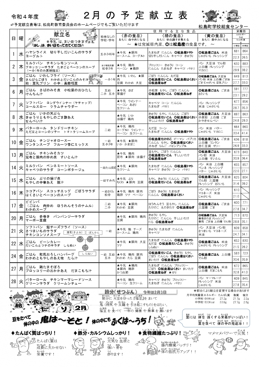 松島町学校給食センターでは、「今日の給食」や毎月の「予定献立表」、「一口メモ」などを発信しております。