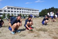3学年が企画している縦割りプロジェクトの一環として、10月の運動会に向け、昼休みに全校で除草作業を行っています(天候等を考慮し、参加可能な生徒のみ)。