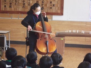 教育支援員が奏でたチェロの音は低く、太く、児童に