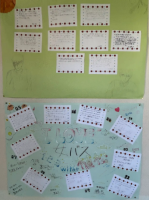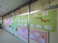 明日の新人大会に向けて、1.2年生は意気込み、3年生は後輩に向けた熱い応援メッセージを、すばる学級は勝利を願ったメッセージボードを作成し、廊下に掲示していました。新人大会では、全力を尽くして頑張ってほしいと思います。頑張れ松中!!