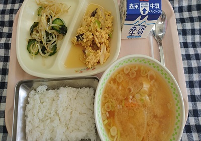今日の給食は、ごはん、親子煮、わかめともやしのあえもの、だいこんと豆腐のみそ汁 です。