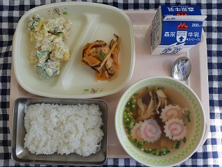 今日の給食は、ごはん、つくね野菜あんかけ、さつまいものサラダ、まいたけのすまし汁、牛乳です。