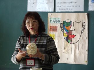 頭の骨の模型を提示しながら、よく噛むことが大事で