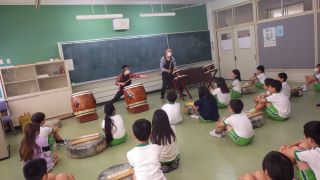 当日は気温が暑かったために児童会室で太鼓の歴史やたたき方などのお話をいただきました。