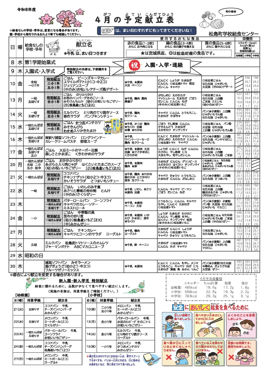 松島町学校給食センターでは、「今日の給食」や毎月の「予定献立表」、「一口メモ」などを発信しております。