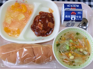 今日は、松島産のたまねぎ、キャベツとえだ豆、大豆、ひよこ豆にベーコンのこくが効いたスープと、デミグラスソースがたっぷりかかったハンバーグ、そして、みかん、パイナップルなどが入ったひんやりとしたゼリーが口の中をさっぱりとさせて、とても味のバランスの良い給食でした。