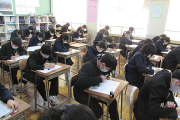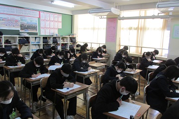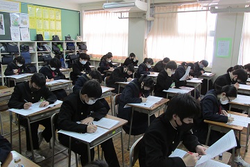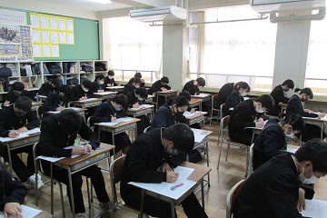 日目でした。一年間のまとめの考査でもあり、どの教室も集中して問題に取り組む生徒たちの姿がありました。金曜日にも残り4教科ありますので明日の休みを有効に使って,臨んでください。