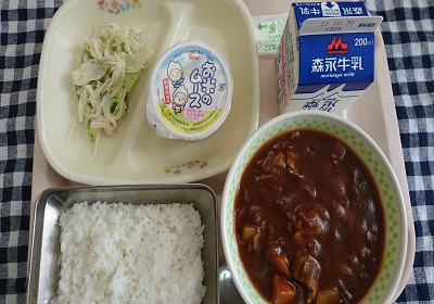 今日の給食は、ごはん、きのこカレー、切り干しだいこんのサラダ、お米のムース です。