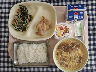 今日の給食は、ごはん、鶏肉のごまみそ焼き、ほうれんそうのおひたし、なめこスープ、くりのムース、牛乳です。