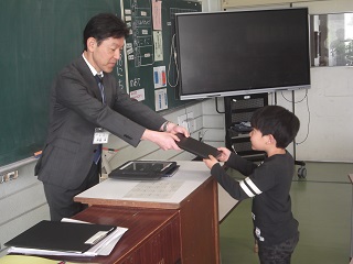 18日(木)の朝、2年生の児童にタブレットを貸し出す式(貸与式)を行いました。
