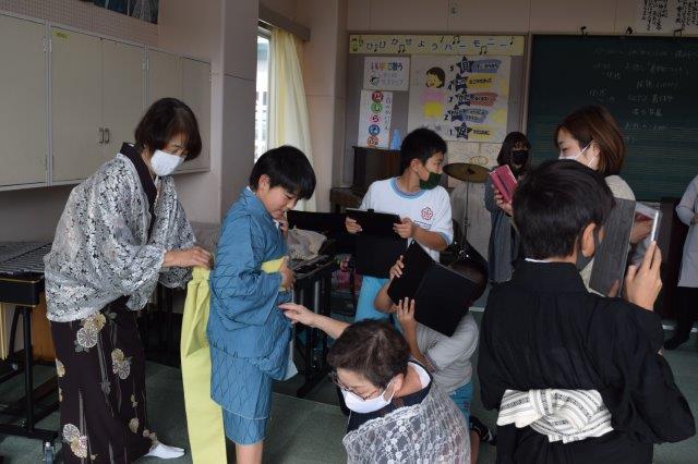 4年生のPTA行事「着物着付け教室」。山野流講師の浅野美枝子先生をはじめ,5名の先生方に丁寧なご指導をいただきました。洋服では出せない着物の艶やかさ。素敵です。子供たちも朝から楽しみにしていて大喜びでした