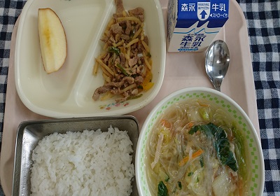 今日の給食は、ごはん、チンジャオロースー、春雨スープ、りんご です。