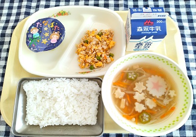 七夕はもともと、夏が旬である、なすやきゅうりを神前におそなえして、作物の実りに感謝する日とされていました。今日の給食では、吹き流しや天の川に見立てた、米粉で作られためんが入っている汁物 に、星型の食品がいくつかかくれています。旬の食材 や、七夕にちなんだ食材をしっかり味わって食べましょう。