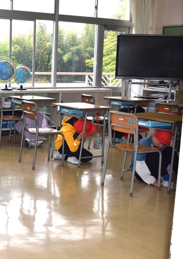 避難訓練の後、校舎内で「ここで地震が来たらどうする?」と話し合いながら教室に戻りました。