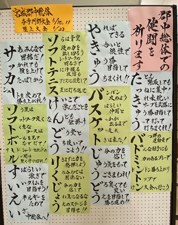 明日の中総体へ向けて、5月下旬から校長先生のメッセージを掲示してきました。一人真剣に見つめる生徒。友達と二人でうなずきながら笑顔で見つめる生徒。部活全員で仲間を鼓舞しながら盛り上がる生徒。それぞれがメッセージを受け取り、明日へ向けて準備してきました。きっと明日は、体現してくれることでしょう。階段に掲示している応援うちわは地域文化部が制作しました。地域文化部の皆さんありがとう!