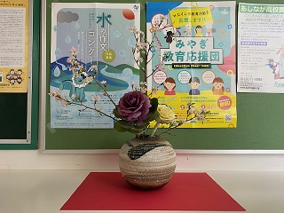 新年を迎え、運動部、吹奏楽部が練習に励んでいます。美術部は作品づくりが始まりました。また、地域文化部の2名が、桜と葉牡丹の切り花を生け、プリムラと葉牡丹の苗を植えてくれました。校舎内が新春らしくより一層明るくなりました。