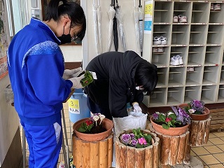 新年を迎え、運動部、吹奏楽部が練習に励んでいます。美術部は作品づくりが始まりました。また、地域文化部の2名が、桜と葉牡丹の切り花を生け、プリムラと葉牡丹の苗を植えてくれました。校舎内が新春らしくより一層明るくなりました。