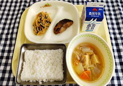 今日の地場産物は、松島産ごはん、豚肉、牛乳です。