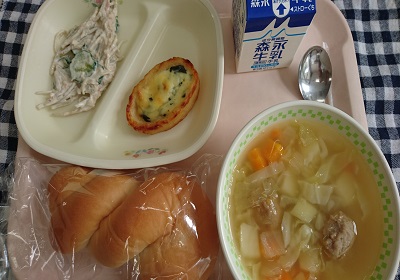 今日の給食は、ツイストパン、ポテトカップグラタン、ごぼうサラダ、ミートボールスープ です。