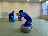 本校には、特別支援学級(すばる学級)を設置しております。保健体育では、体力を高める運動として、準備運動でバランスボールを活用して楽しみながら体幹を鍛えています。音楽を流しながら楽しく学習しています。