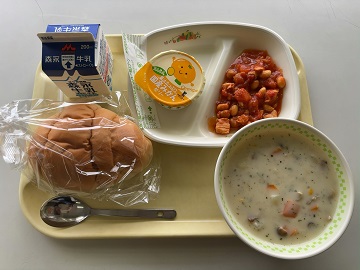 バターロール・鶏肉と豆のトマト煮・クラムチャウダー・ミカンゼリー