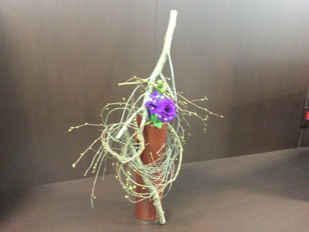 トルコキキョウとミズキでアレンジした斬新な生け花を生けていただきました。