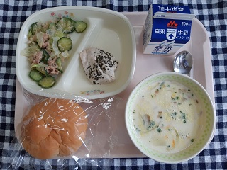 今日の給食は、ミルクパン、ガーリックバジルチキン、キャベツとツナのサラダ、クリームパスタスープです。